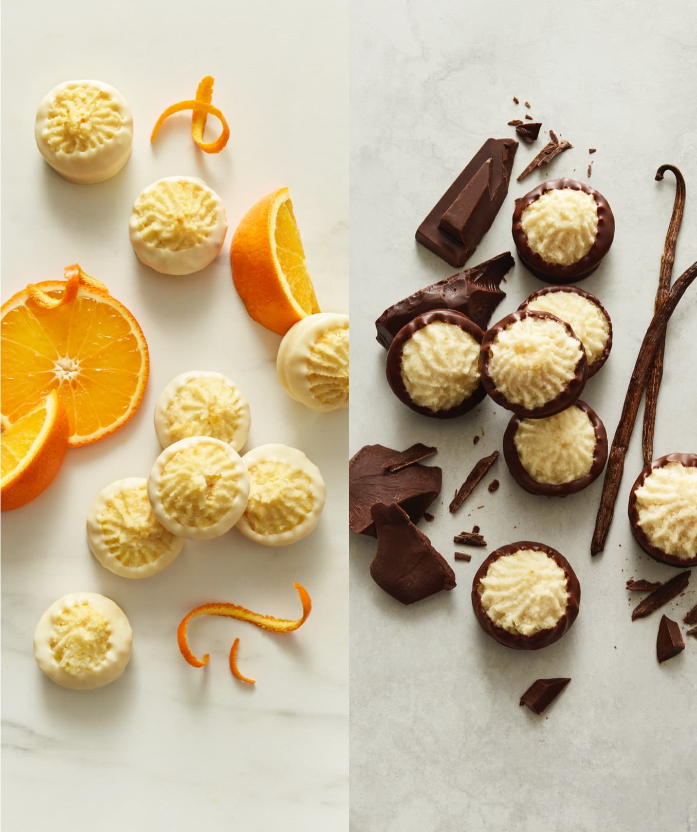 6 Orange Macaroons dipped in white chocolate & 6 Vanilla Macaroons dipped in dark chocolate Macaroons