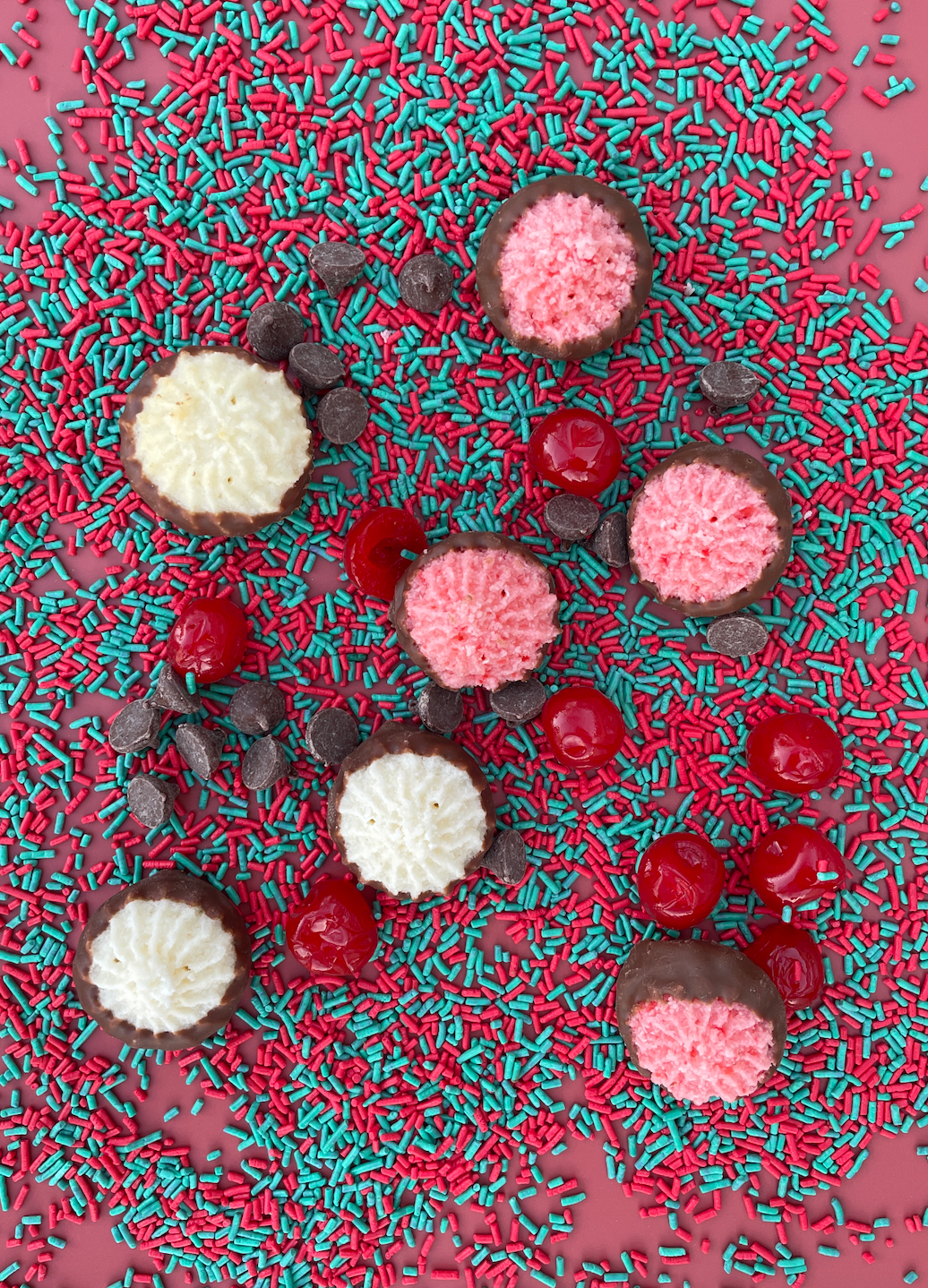 Maraschino Cherry & Vanilla Macaroons Dipped in Milk Chocolate