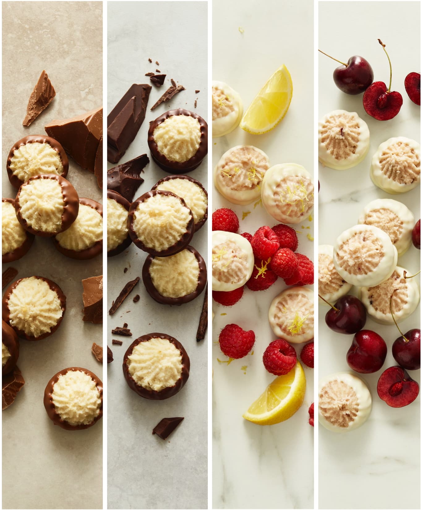 Enjoy 3 Macaroons of each: Vanilla dipped in milk chocolate, Vanilla dipped in dark chocolate, Raspberry-Lemon dipped in white chocolate and Dark Cherry dipped in white chocolate.