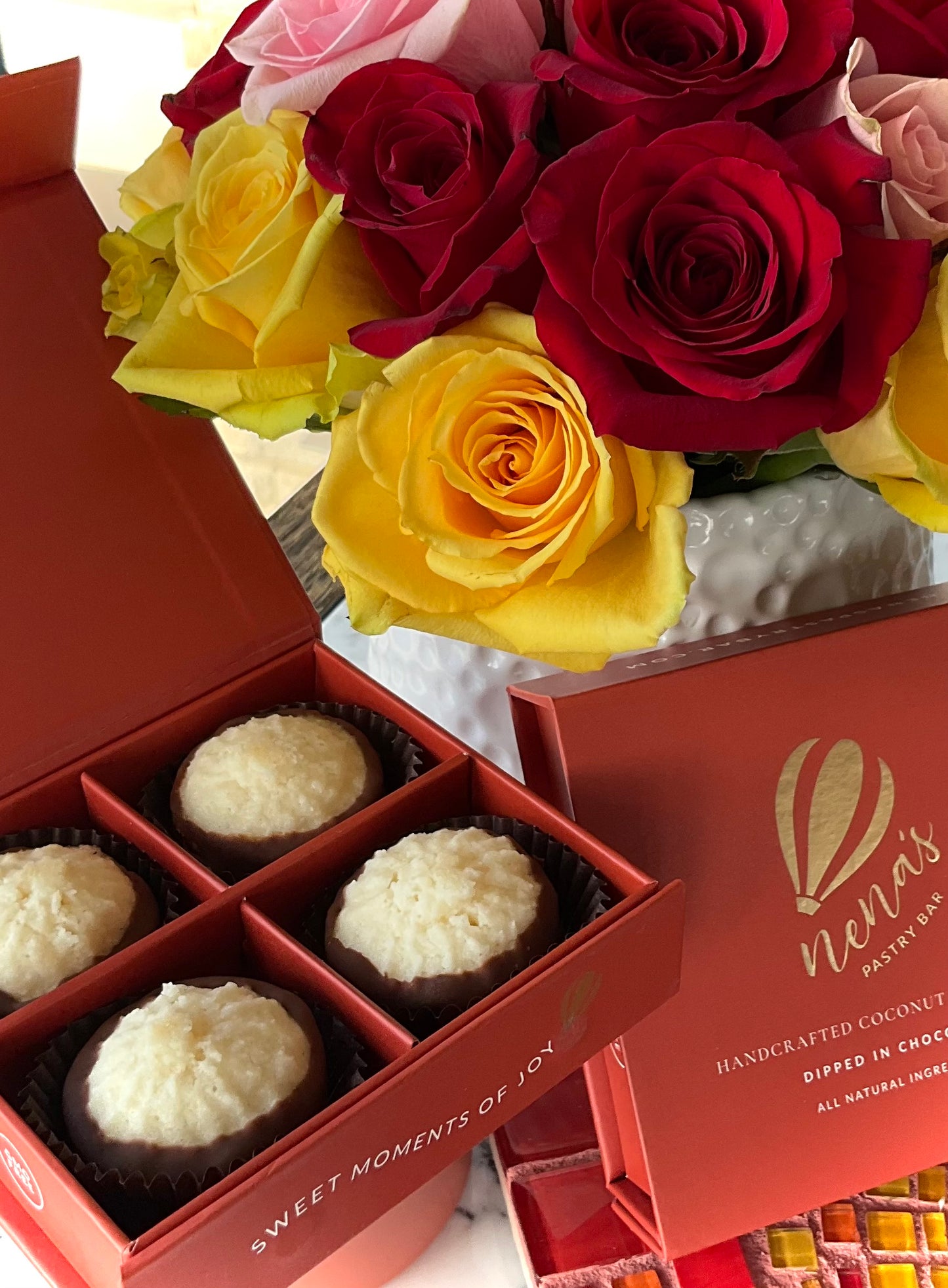 4 pc box. Best seller flavor: Vanilla macaroon dipped in milk chocolate