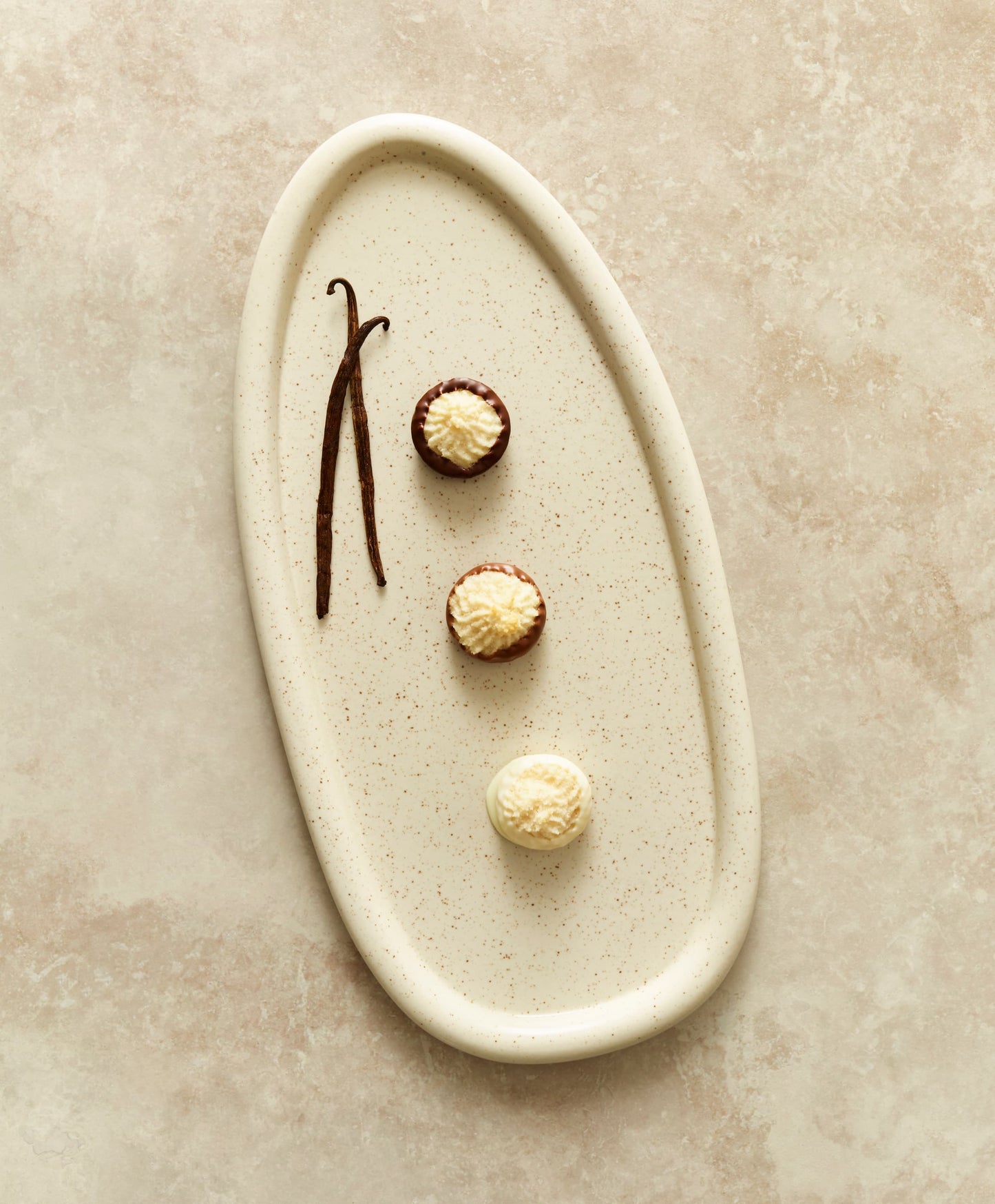 4 Vanilla Macaroons dipped in each chocolate: white, milk and dark.