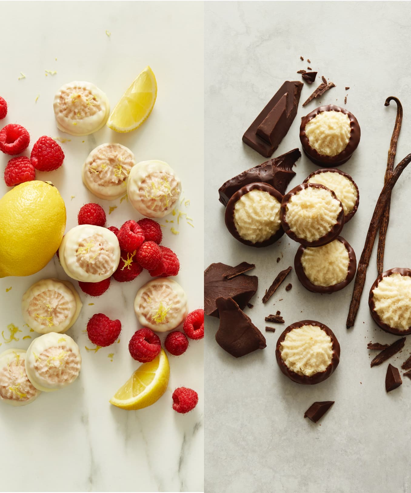 6 Raspberry-Lemon Macaroons dipped in white chocolate & 6 Vanilla Macaroons dipped in dark chocolate.